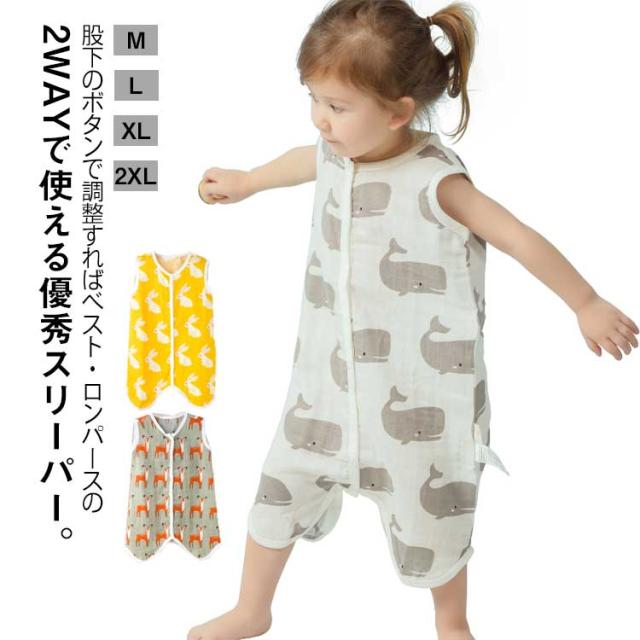 | 股下のボタンで調整すればベスト・ロンパースの2wayで使える優秀スリーパー。 可愛いデザインで着やすい♪ 薄くて柔らかいコットンガーゼ素材でお肌に優しくてベビーに配慮♪ 長時間着ても赤ちゃんの負担になりません。 素肌にやさしいガーゼ素材なので、通気性、吸水性もよく、蒸れずに快適。 | |