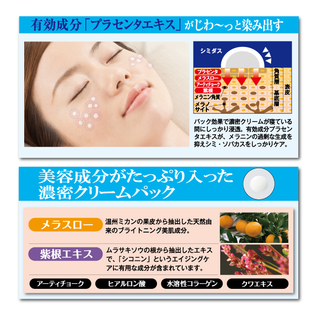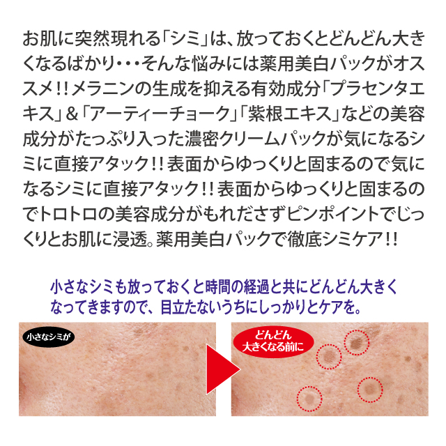 | 特徴 | \気になる“その一点”に、ふたをしてじわ〜っと集中ケア!/ メラニンの生成を抑える薬用美白※成分「プラセンタエキス」配合! 気になるシミ部分にだけ塗って、乾かして、ペリッとはがすだけ。 濃密クリームが肌に密着し、じっくり角質層まで浸透します。 【薬用美白成分「プラセンタエキス」配合!】 美白有効成分が、メラニンの生成を抑えて、シミ・そばかすを防ぐ。 気になるポイントに塗るだけで、集中美白ケアが叶います。 【“貼らない”パックで手軽に!】 シートパックのように貼る必要なし。 濃密クリームを塗って乾かすだけのピールオフタイプだから、手軽に集中ケアが続けられます。 【密着感×高浸透※でじわ〜っとケア】 気になる部分に塗ると、しっかりフタをして有効成分を逃さず密閉。 乾いた後にペリッとはがせば、不要な角質も一緒にOFF! |