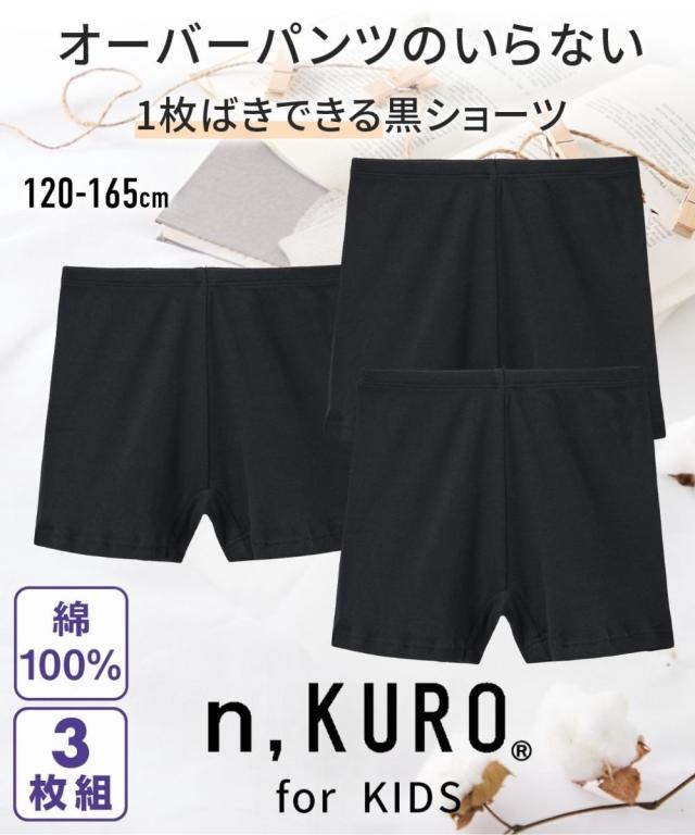 n,KUROキッズ オーバーパンツの要らない綿100%黒無地1分丈ショーツ3枚組 女の子 子供 小学生 中学生 ガールズ