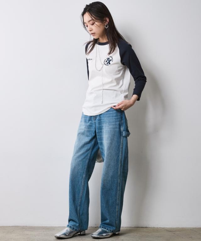 カジュアルコーデをアップデートする配色ラグランスリーブTシャツ。 ■デザイン 身頃と袖の配色のコントラストが特徴的なラグランスリーブTシャツ。 カレッジ風のロゴマークがプリントされヴィンテージライクな雰囲気をプラス。 大きすぎず、タイト過ぎないので着回ししやすいTシャツです。 ■素材 ソフトで肌ざわりのいい、フライス生地を使用。 ■おすすめのスタイリング デニムボトムとの相性はもちろん抜群ですが、大人フェミニンなサテン生地のスカートやインパクトのあるレオパード柄のスカートと合わせたミックススタイルもオススメです。