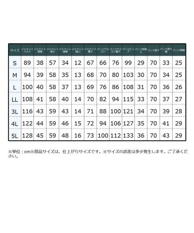 品質=[表地]ポリエステル100%(織物 平織) [裏地]有(ジャケット:背抜き)パンツ無 ジャケット:肩パッド無 前ボタン開 ポケット前2・左胸・左内2・右内2 袖口ベンツ 後ベンツ パンツ:前ファスナー内ボタン付ホック開 ウエスト後ゴム入 ポケット両脇・後飾り ※この商品は2点同サイズのみで販売します。 ※LLサイズから四面体仕様です。 原産国:中国製(企画デザインは日本) 備考:洗濯機OK ネット使用 ※単位:cm※商品サイズは、仕上がりサイズです。※サイズの誤差は多少発生します。ご了承ください。
