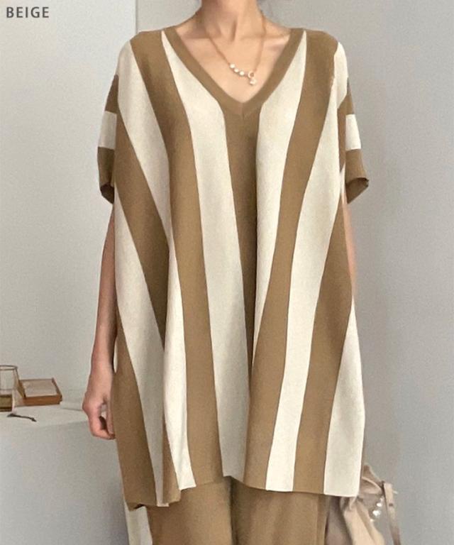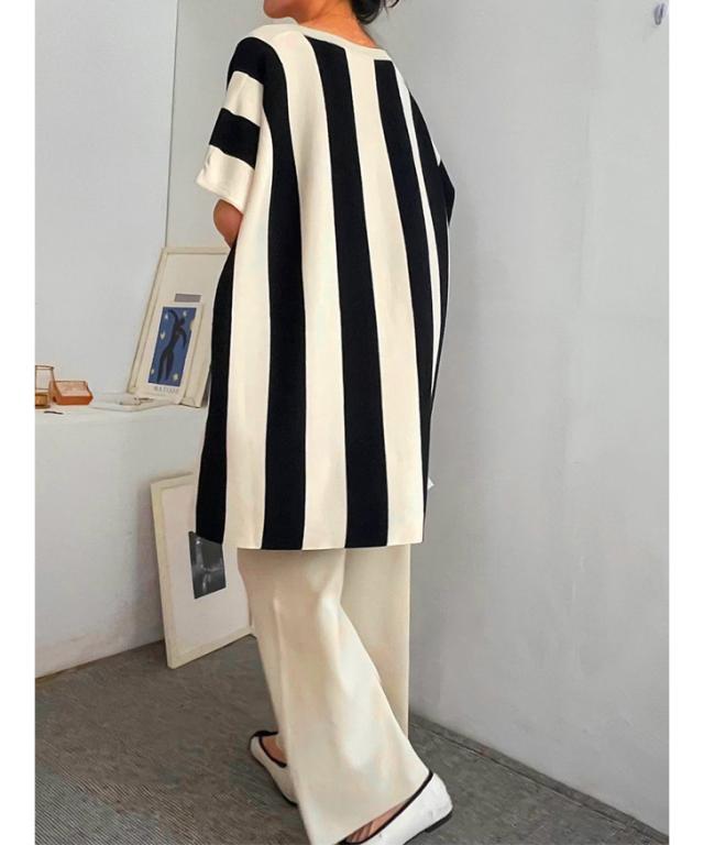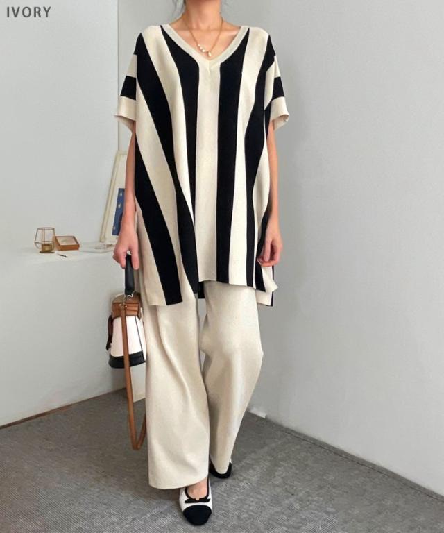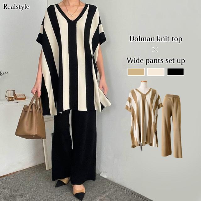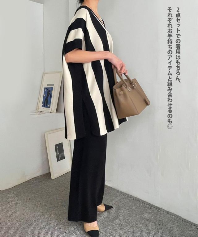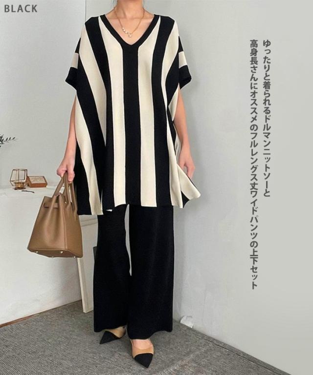 太ストライプドルマンビッグニットソー×ワイドパンツセットアップ レディース ライトニット カットソー 半袖 トップス ボトムス 上下 春夏 薄手 大きいサイズ 大きめ ゆったり Vネック ウエストゴム おしゃれ 2点セット 上下セット 長ズボン ウエストゴム モモンガ 体型カバー 春 夏 秋 高身長 シンプル ラフ ルーズ かわいい カジュアル 楽ちん ロングパンツ イージーパンツ ズボン プルオーバー ビッグシルエット ドルマンニット ドルマンカットソー ワイド フレンチスリーブ 長い 長め 大きい ストレッチ 伸縮 伸びる 落ち感 ロングシーズン やわらか 柔らかい スリット フルレングス 可愛い オシャレ お洒落 かっこいい ナチュラル おうち時間 ぽっちゃり 妊婦 マタニティ 普段着 普段使い ワンマイル 部屋着 ルームウェア ダンス 衣装 ストリート ストライプ柄 縦縞 総柄 しましま 縞々 軽量 ウォッシャブル 洗える 10代 20代 30代 40代 50代 ママ 学生 デイリー 新生活 衣替え 着回し ワンマイルウェア ボックスシルエット 白 黒 ホワイト ブラック ベージュ きれいめ 上品 韓国ファッション 細見え 着痩せ 美脚 脚長 お尻カバー ヒップカバー お腹カバー サイドスリット スリット入り