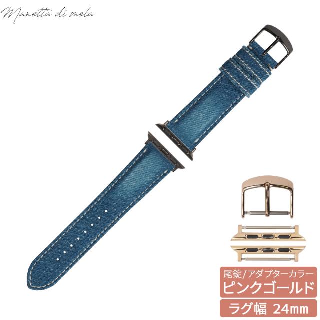 マネッタ ディ メーラ Manetta di mela アップルウォッチ Apple Watch 替えバンド ベルト メンズ レディース 岡山デニム 24mm クラッシュ ホワイトステッチ/ピンクゴールド EDCA-IWP24