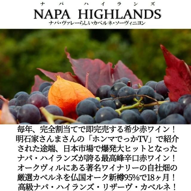 毎年、完全割当てで即完売する希少赤ワイン!明石家さんまさんの「ホンマでっかTV」で紹介された途端、日本市場で爆発大ヒットとなったナパ・ハイランズが誇る最高峰辛口赤ワイン!オークヴィルにある著名ワイナリーの自社畑の厳選カベルネを仏国オーク新樽95%で18ヶ月! 高級ナパ・ハイランズ・リザーヴ・カベルネ!