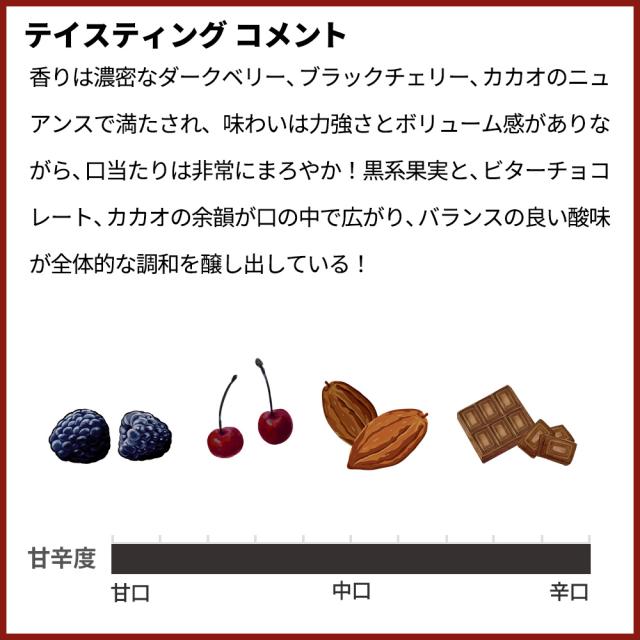 ![]() ■ぶどう品種:カベルネ・ソーヴィニヨン100% ■熟成:18ヵ月熟成 2022年についてワイナリーは、「赤ワインは見事なストラクチャーと深みのある色調、緻密でリッチなタンニン、豊かな果実味とアロマを備えている。このヴィンテージの特徴であるユニークな気候が、ナパ・ヴァレーの多彩な個性を引き出し、生き生きとしたフレッシュなタイプから力強く濃密なタイプまで、ナパ・ヴァレーを表現する様々なワインを生み出した。」と絶賛! 深紅に近い濃い色合い!香りは濃密なダークベリー、ブラックチェリー、カカオのニュアンスで満たされ、味わいは力強さとボリューム感がありながら、口当たりは非常にまろやか!良く熟した葡萄が使われていることが感じ取られ、若いワインとしてはかなり滑らかでしなやかな質の良いタンニンが見事に表現されている!黒系果実と、ビターチョコレート、カカオの余韻が口の中で広がり、バランスの良い酸味が全体的な調和を醸し出している! このワインは若いうちから十分に楽しめ、さらなる瓶熟も十分に期待できる!最高峰ナパ・ハイランズ・リザーヴ・カベルネ・ソーヴィニヨンが超限定で正規代理店輸入品で登場! |