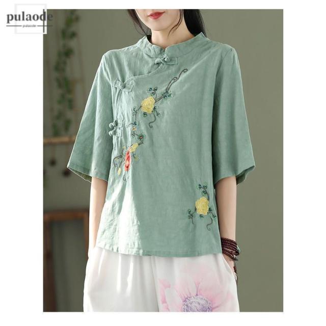 商品説明:チャイナ風 シャツ トップス ブラウス 花柄 刺〓 綿麻