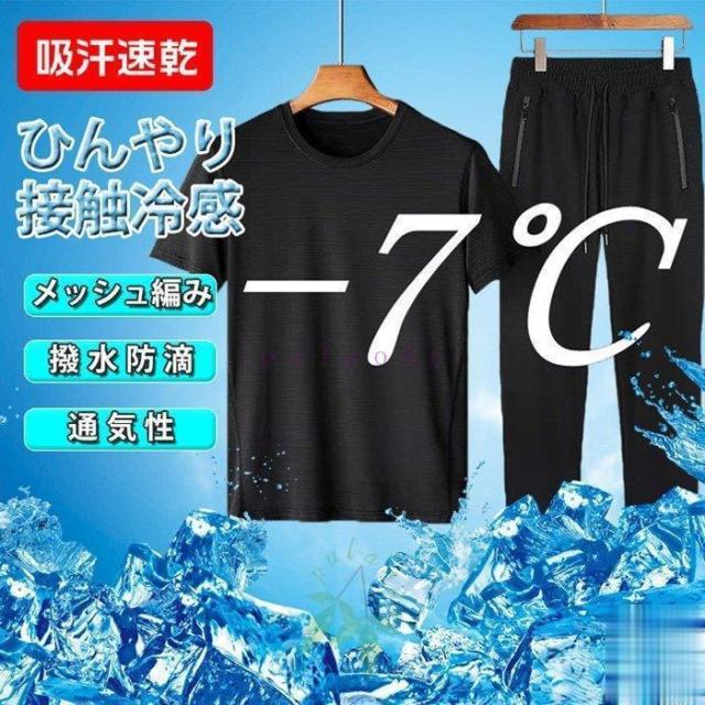 上下セット 半袖 メンズ 夏 接触冷感 無地 Tシャツ ロングパンツ 防滴 吸汗 速乾 ドライ 通気性 軽量 ストレッチ 快適 薄手 インナー スポーツウエア 運動着 ルームウェア 部屋着 メッシュ クルーネック 涼しい 肌触りセットアップ 夏服