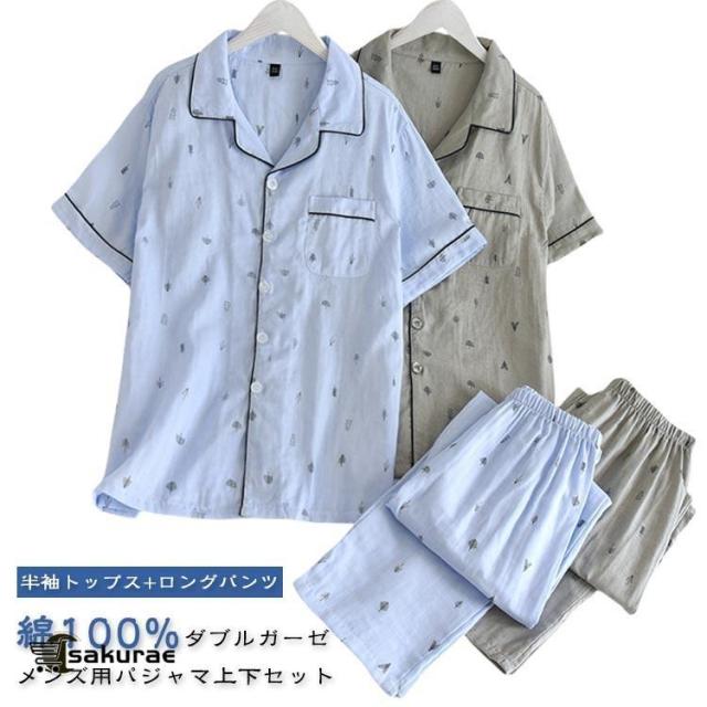 綿100% ダブルガーゼ パジャマ ガーゼ メンズ 春 夏 半袖 tシャツ ロングパンツ 綿 ルームウェア 二重ガーゼ ナイトウェア セットアップ 上