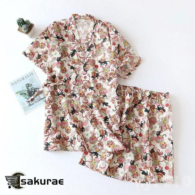 おやすみ甚平パジャマレディース夏綿半袖ダブルガーゼ綿甚平パジャマ桜柄夏入院大人用大きいサイズショットパンツルームサプリ30代40代20代