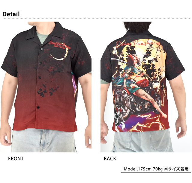絡繰魂の姉妹ブランドとして誕生した、従来の和柄から抜け出し、和の持つ美しさを融合させた【抜刀娘】から「抜刀娘 昇華転写 闇半袖シャツ(252959)」のご紹介です。 美しい娘をモチーフの主役に採用した半袖シャツが登場。 背中には葵がバイクで出陣する姿が描かれています。 着物や帯の柄にまで拘るのが抜刀娘流。 ボディーには、てろんとした肌触りのポリエステル生地を採用。 | |||||||||||||||||||||||||
