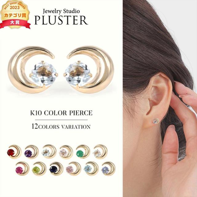 色鮮やかに輝く 誕生石ピアス 。月のモチーフとの組み合わせは、華やかで、お守りとして身につけても。誕生日のギフトや、記念日の贈り物に。10金素材で金属アレルギーに対応しているので、お肌に優しく安心です。