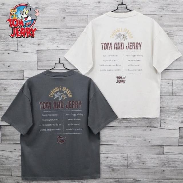 人気キャラクター、トムとジェリーのバックプリント半袖Tシャツ。
