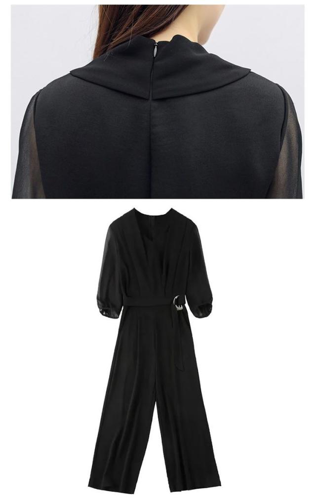 | Vネックの胸元が綺麗でセクシーな印象に スッキリした印象の背中のファスナー ウエストをベルトでしめてメリハリをつけます 体のラインを出しつつ全体的に着?せ効果 パンツのメリハリをつけるサイドのポケット | |