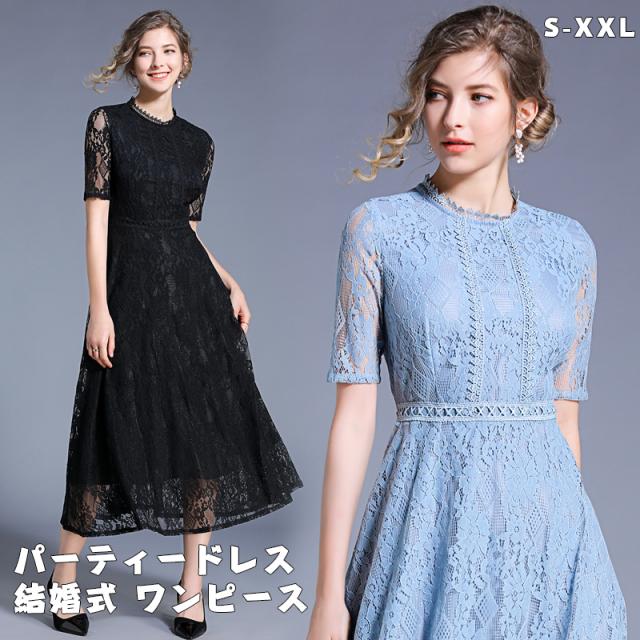 パーティードレス ミモレ丈 総レース ドレス 続々登場 ブラック ブルー S XL XXL