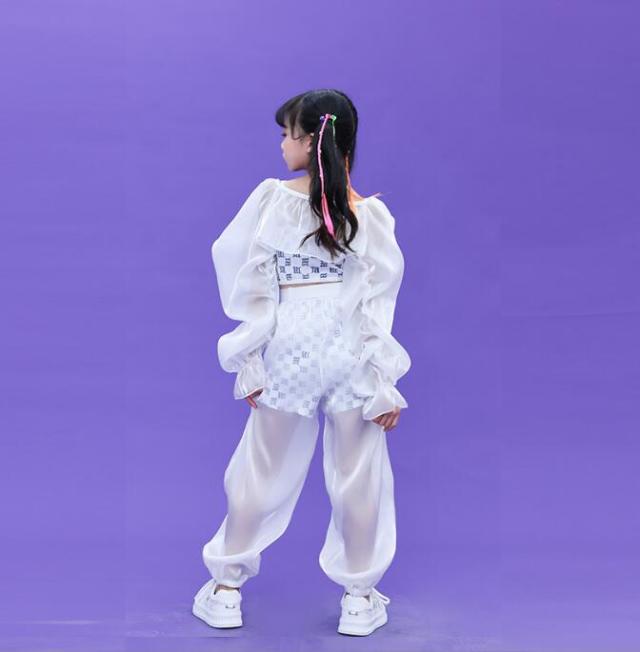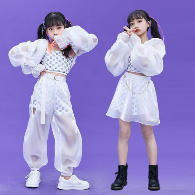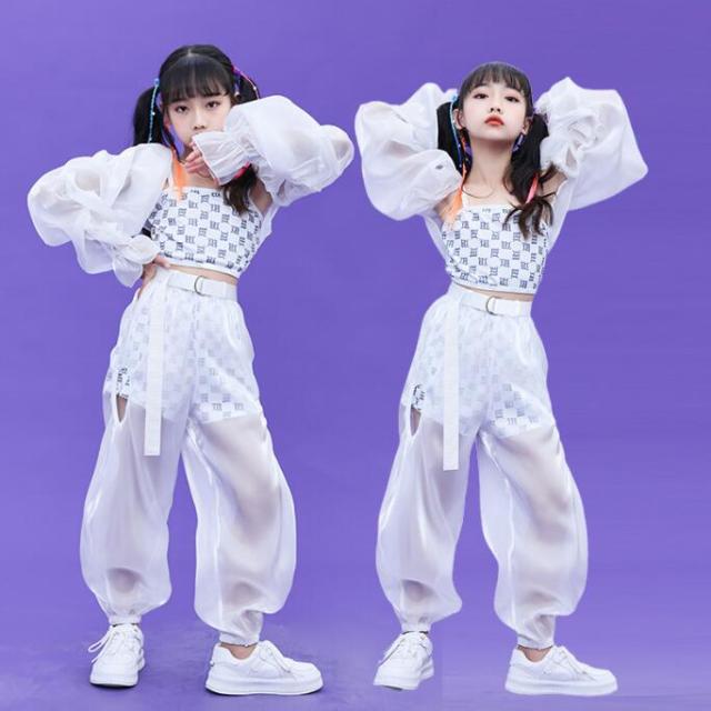 女の子 ダンス衣装 子供 ジャズダンス パンツセット スカートセット jazz hiphop ダンス 衣装 パーフ袖 サルエルパンツ シースルー 演出服 ステージ衣装 練習着 ホワイト 個性
