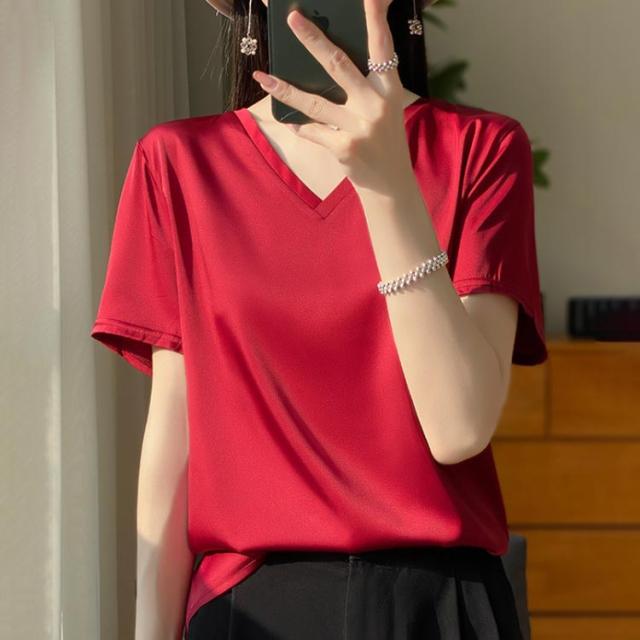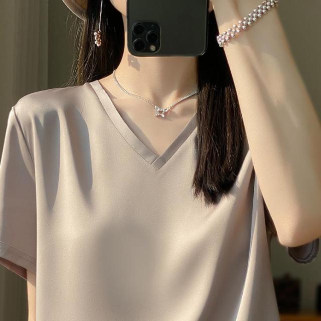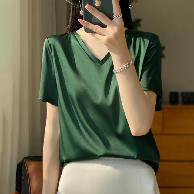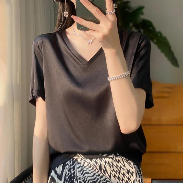 THOM WILLS シャツ シルク ブラウス 半袖 レディース 夏 tシャツ サテン プルオーバー Vネック シャツブラウス トップス 体型カバー インナー 大きいサイズ 吸湿 通気性 速乾 薄手