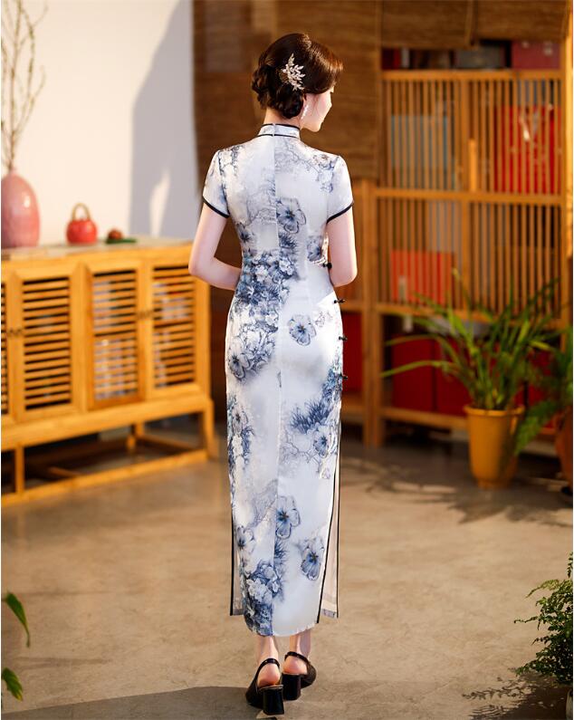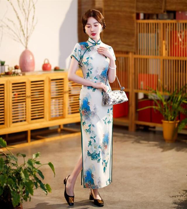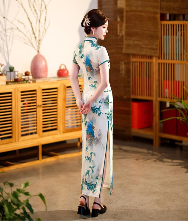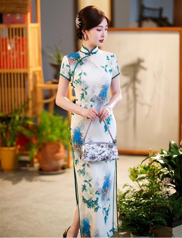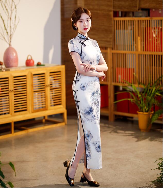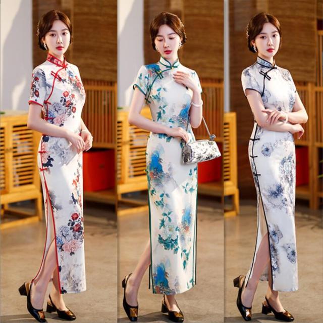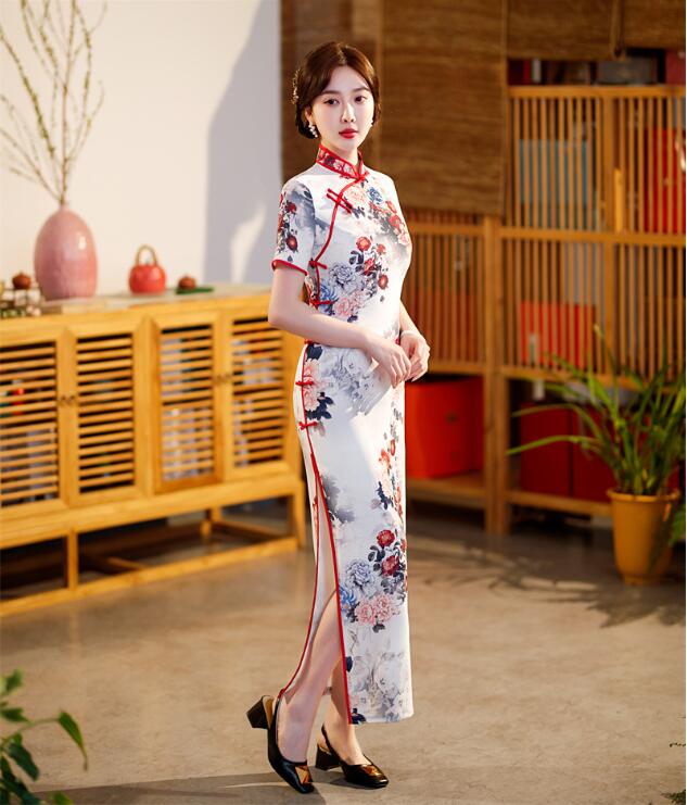 チャイナドレス ロング丈 半袖 マキシ丈 チャイナ ドレス レディース 大人 チャイナカラー 中華ドレス 白に新鮮な花柄 チャイナ服 中国古典ダンス衣裳 発表会 演奏会 箏 二胡 演 お呼ばれ