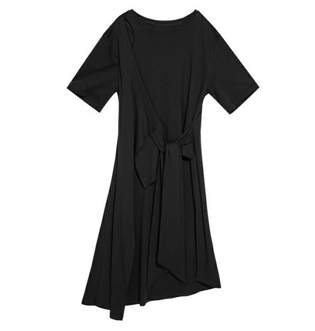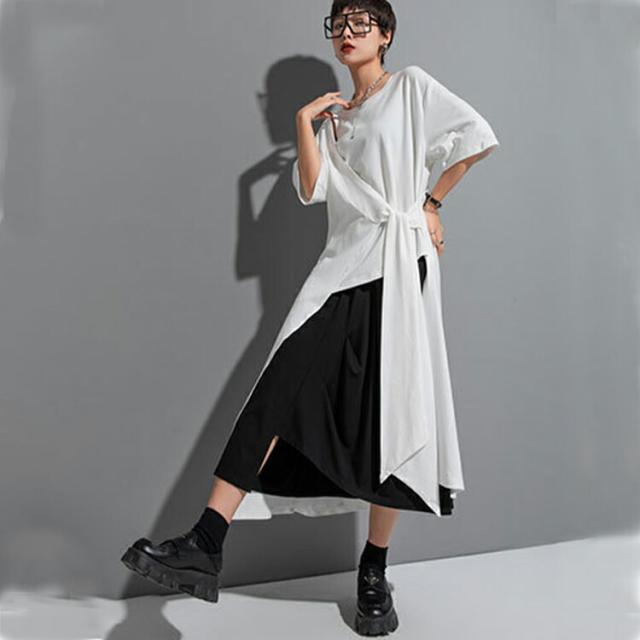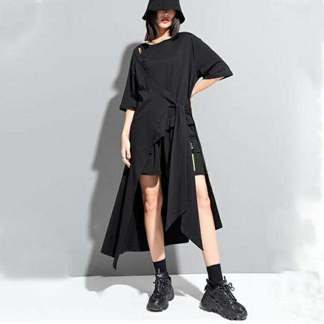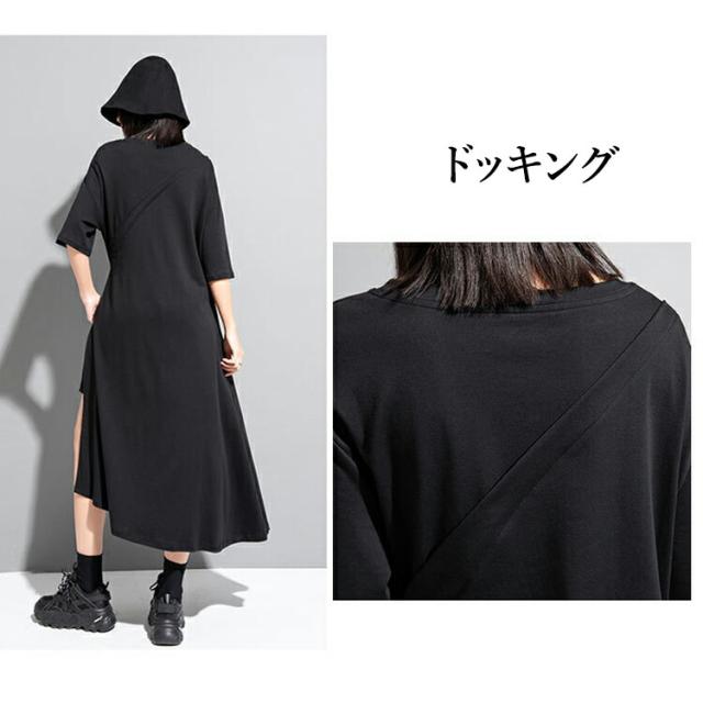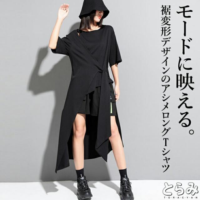 ヘムデザインTシャツ Tシャツ レディース 半袖 モード系 トップス カットソー ワンピース Tシャツワンピース 前後差 レイヤード風裾変形 無地 個性的 夏 夏服 とらみ ユニセックスカジュアル