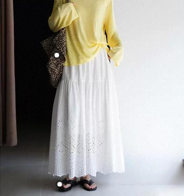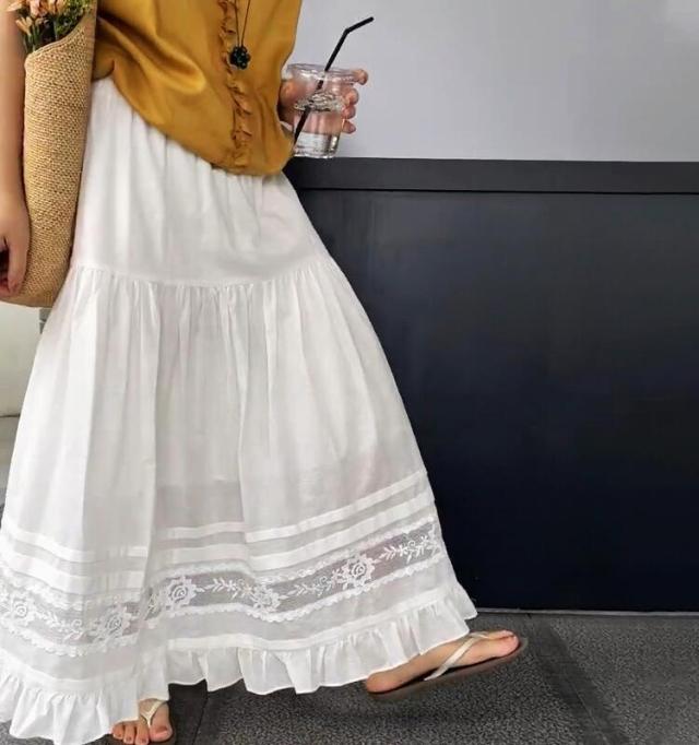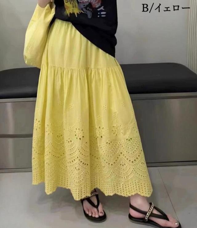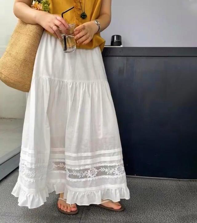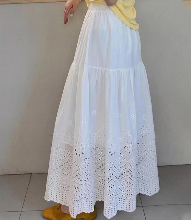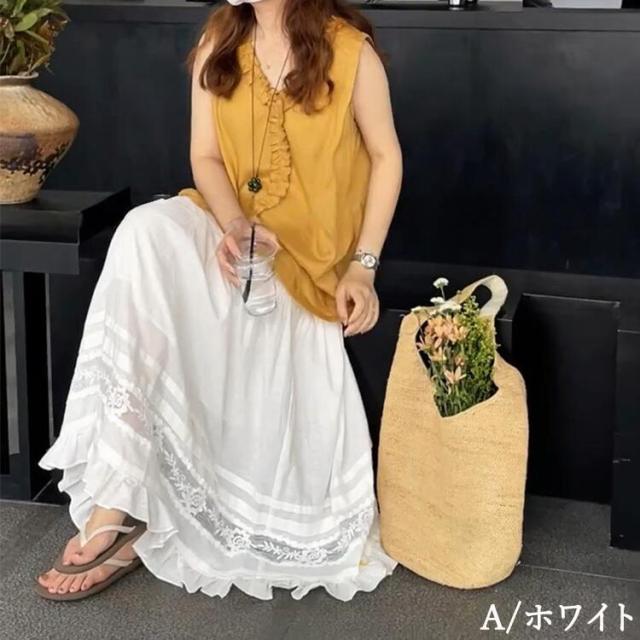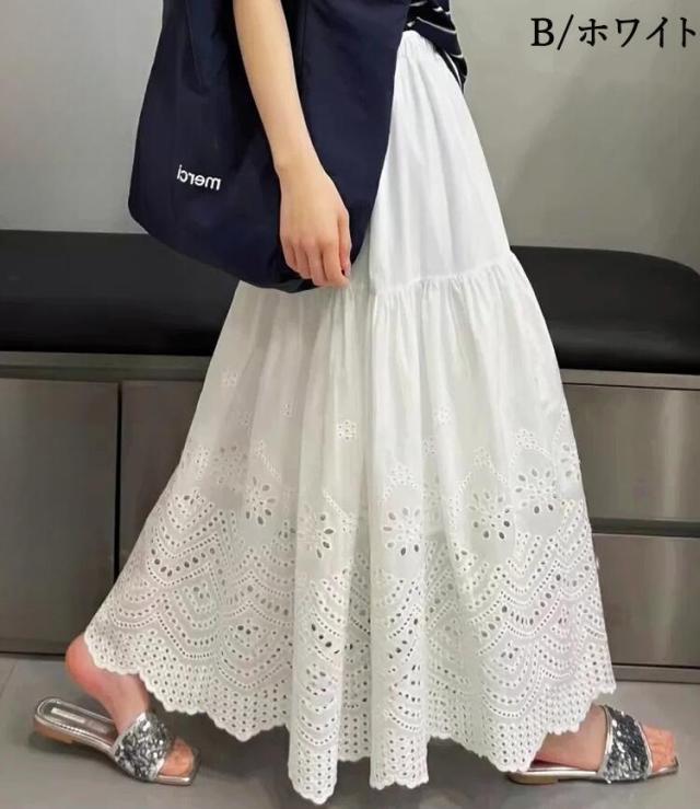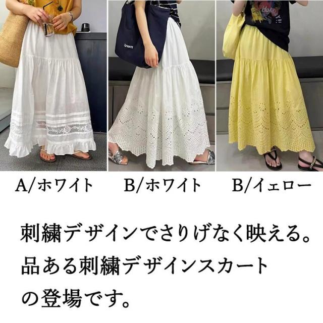 刺繍フレアスカート スカート レディース ロング 夏 きれいめ ボトムス ロングスカート ティアードスカート フリル レース aライン ウエストゴム カジュアル ゆったり 大きいサイズ 白 ホワイト 30代 40代 50代 60代 高身長 低身長 とらみ 送料無料