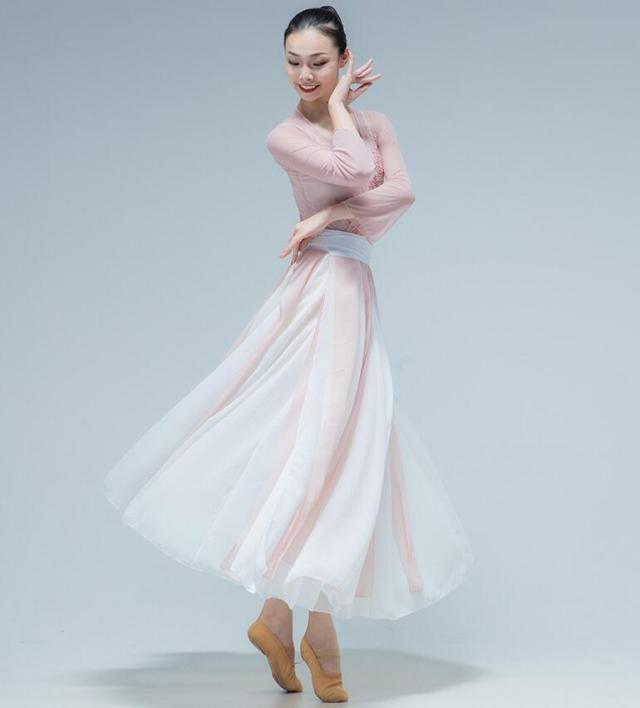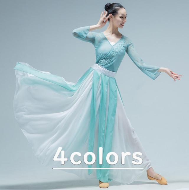 レディースダンス衣装 古典ダンス ロング丈スカート 大きい裾 シフォンスカート スプライス モダンダンス 社交ダンス ステージ衣装 練功服 3点セット 中華風ダンス衣装
