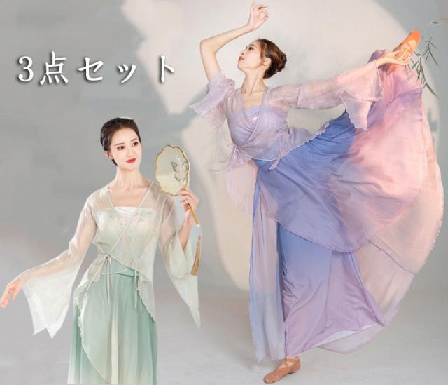 中華風ダンス衣装 フレア袖 チャイナ服 ロコス 羽織 グラデーション ガウチョパンツ ワイドパンツ スカーパン 漢風 ダンス衣装 演出服 エスニック コスプレ 古風美人 撮影衣装 ステージ衣装