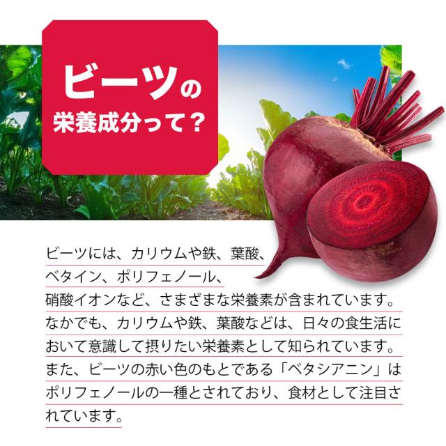 | 商品説明 | ・ほのかに甘い味わい ・色の濃いデトロイト種の有機ビーツを粉末に ・着色料・香料・添加物は一切不使用! ・細かいパウダーで水にも溶けやすい ビーツにはカリウムや鉄、葉酸、ベタイン、ポリフェノールなど様々な栄養素が含まれています。 そんな栄養豊富なビーツをさらに有機栽培し安心安全に!スープやデザート、サラダのドレッシングやちょっとした色付けにも。 美味しく健康を取り入れられる無添加有機栽培のビーツパウダーです。 ※粒子の細かいパウダーのため開封後はなるべくお早めにご使用ください。できるだけ高温多湿を避け、直射日光の当たらないところでの保管をお願いします。 |
