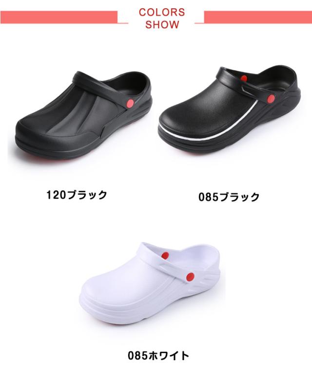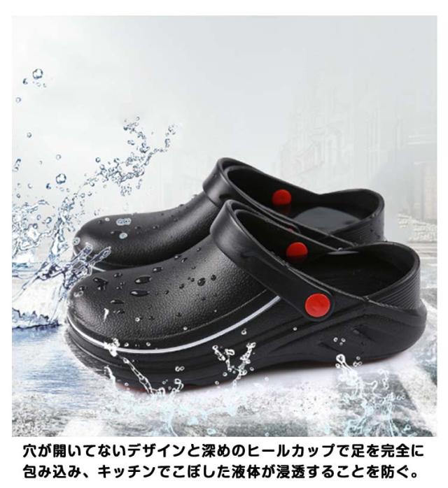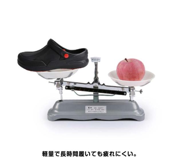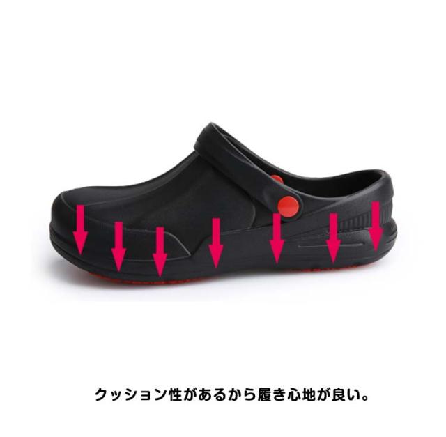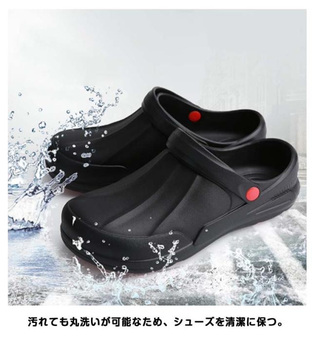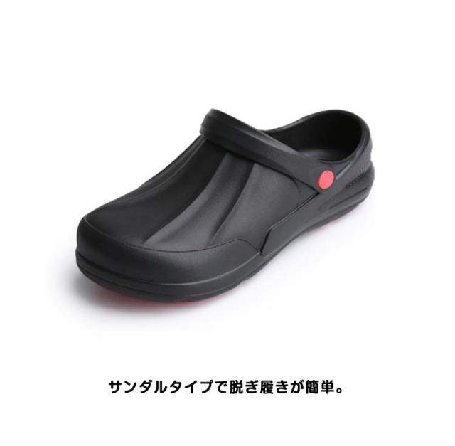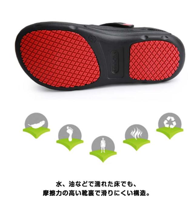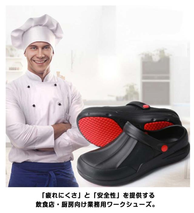 | 飲食店などで働くプロフェッショナル・メンズ.レディースの快適性を実現するコックシューズ サンダルタイプで脱ぎ履きが簡単。 穴が開いてないデザインと深めのヒールカップで足を完全に包み込み、キッチンでこぼした液体が浸透することを防ぐ。 水、油などで濡れた床でも、摩擦力の高い靴裏で滑りにくい構造。 軽量で長時間履いても疲れにくい。 クッション性があるから履き心地が良い。 汚れても丸洗いが可能なため、シューズを清潔に保つ。 「疲れにくさ」と「安全性」を提供する飲食店・厨房向け業務用ワークシューズ。 | |
