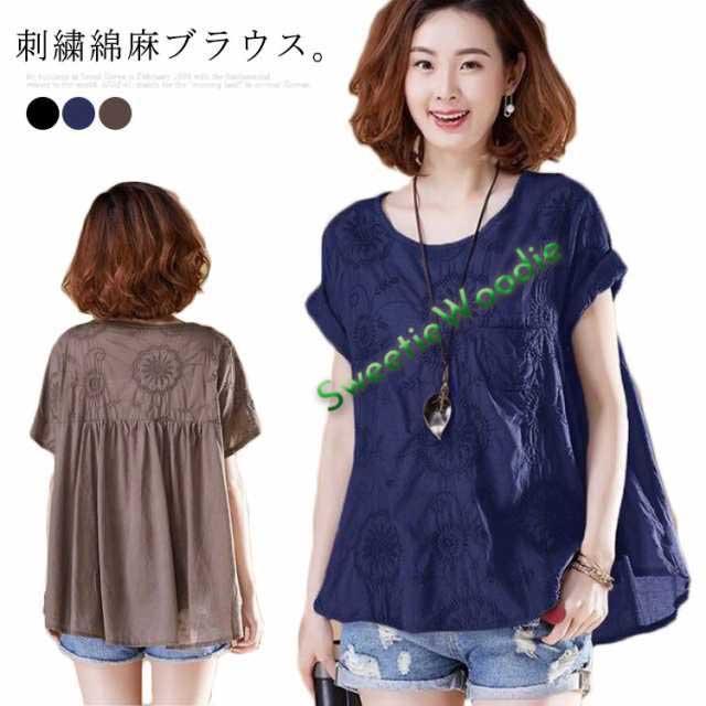 刺繍ブラウス 半袖 レディース 綿麻 シャツブラウス トップス プルーオーバー ゆったり 体型カバー コットン リネン 送料無料 着痩せ 無地 薄手 涼しげ おしゃれ カジュアル 大きいサイズ 夏