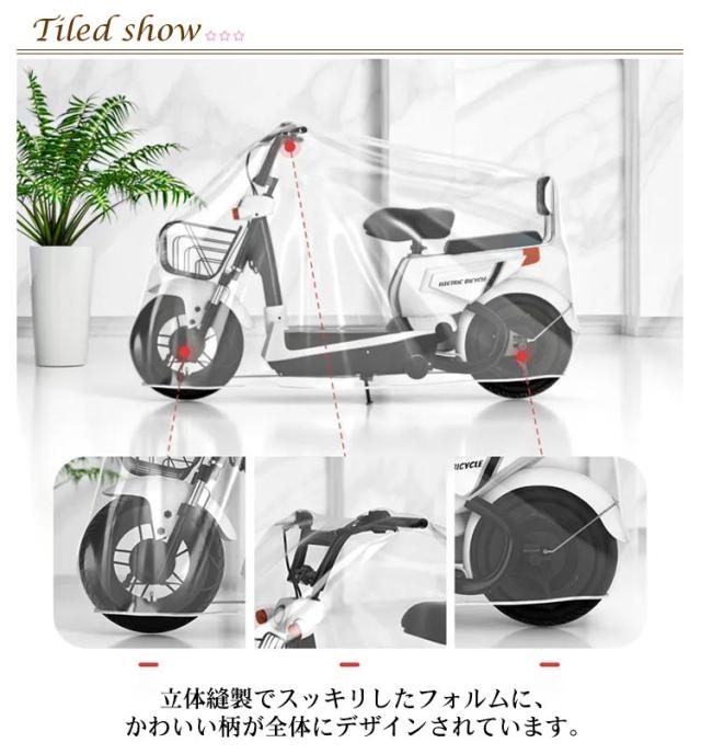 | 雨対策に最適な自転車カバー 撥水加工を施しているので、梅雨時期や雨の日に効果を発揮します 立体縫製でスッキリしたフォルムに、かわいい柄が全体にデザインされています 自転車、電動自転車やバイクのレインカバーとして大活躍! | |