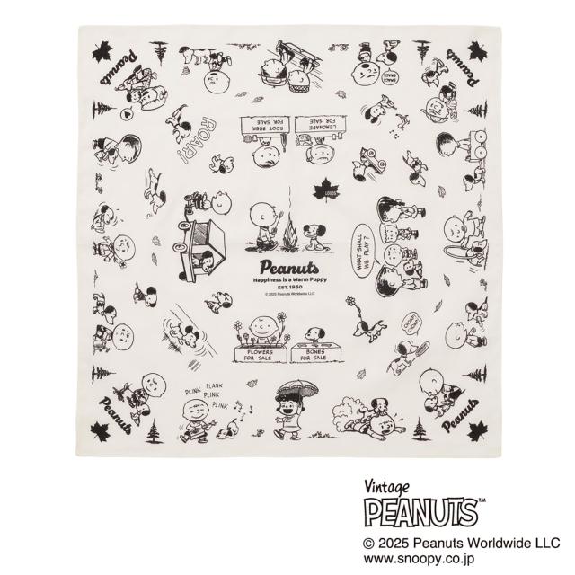 コミック[ PEANUTS ]の誕生 75 周年を記念したシリーズのマルチに使えるバンダナ。 1950 年代初頭のアートを使用したヴィンテージ感溢れるデザインが特長のバンダナです。ハンカチ、お弁当包み、ランチョンマット、スカーフなどなど使い方さまざまです。