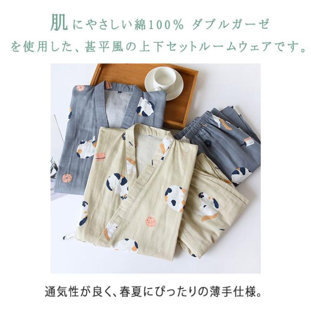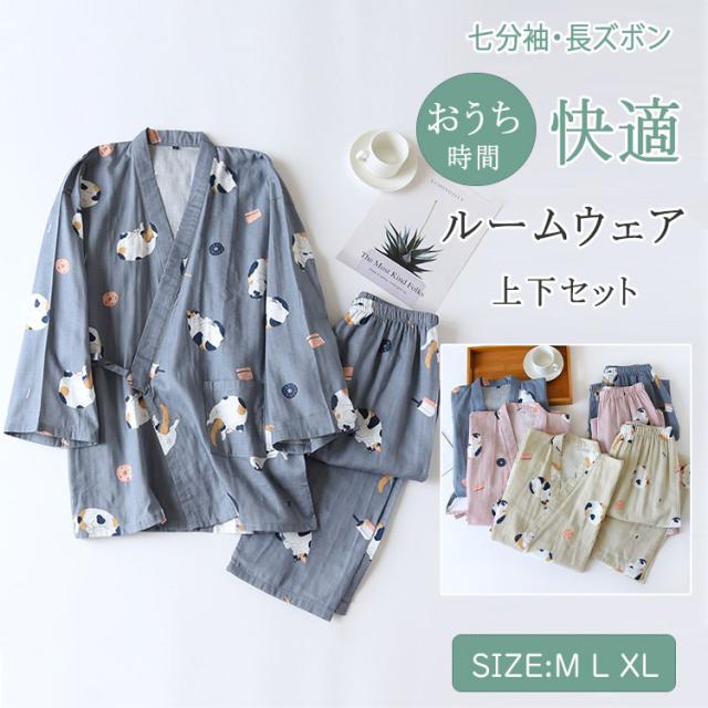 ルームウェア レディース メンズ 上下セット 甚平風 綿100% ダブルガーゼ ネコ柄 七分袖 長ズボン 和風 パジャマ 部屋着 前開き ナイトウェア ワンマイルウエア 薄手 春夏 快適 プレゼント