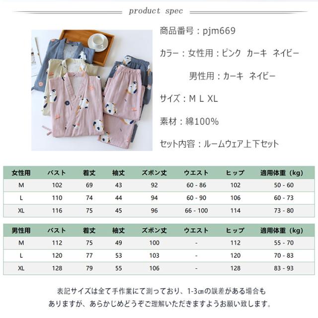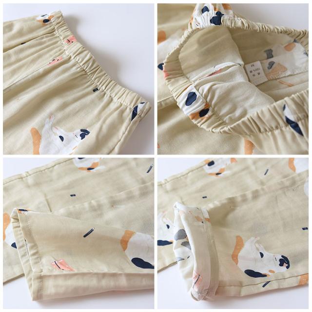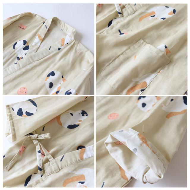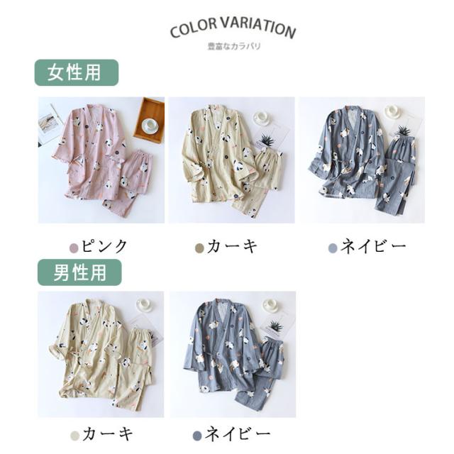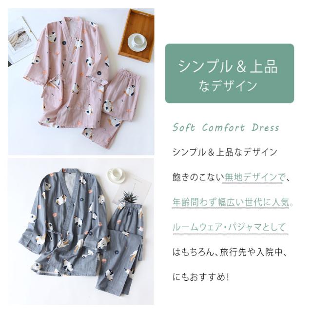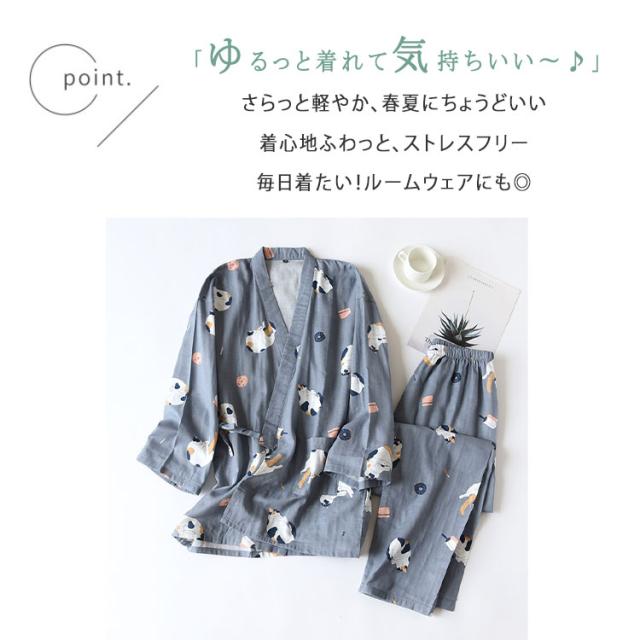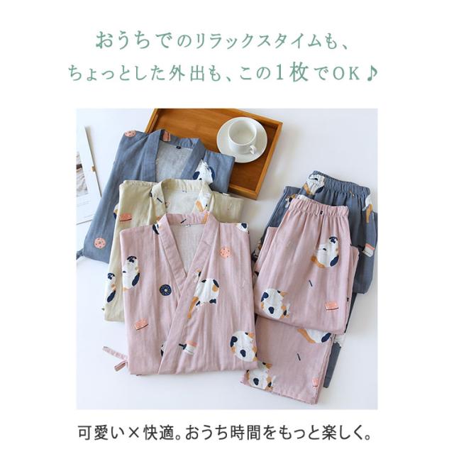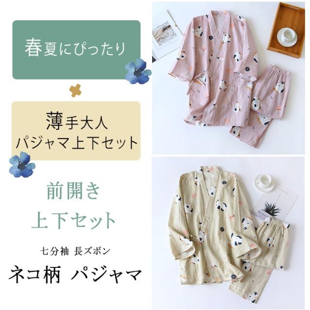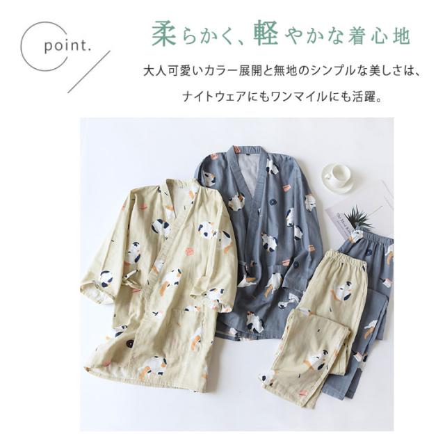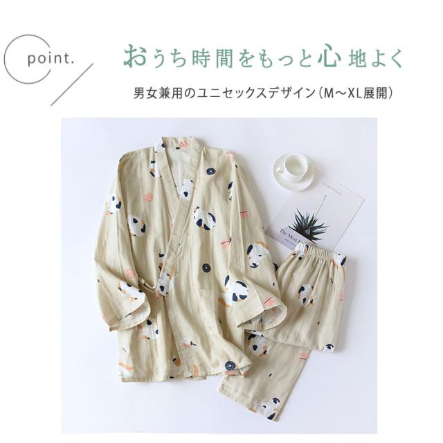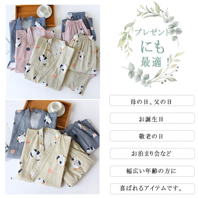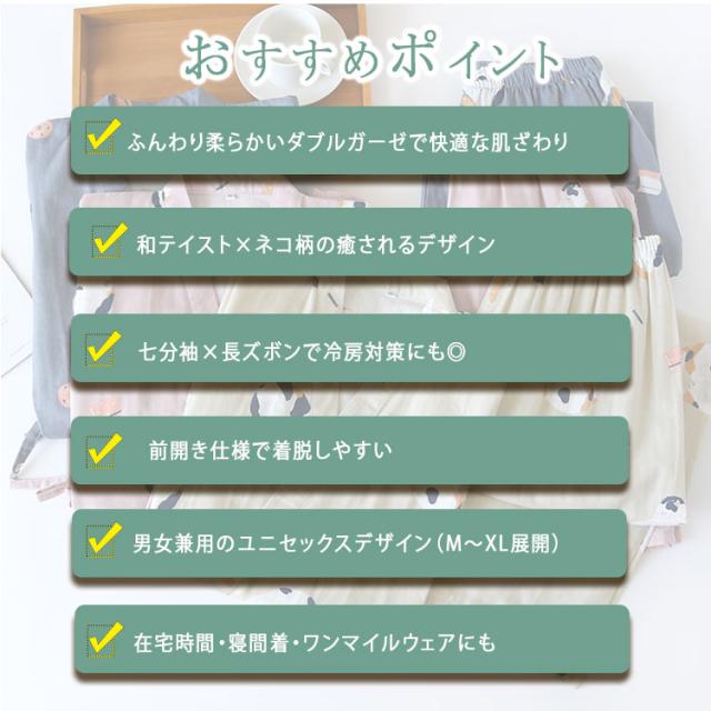 商品名 | ルームウェア レディース メンズ 上下セット 甚平風 綿100% ダブルガーゼ ネコ柄 七分袖 長ズボン 和風 パジャマ 部屋着 前開き ナイトウェア ワンマイルウエア 薄手 春夏 快適 プレゼント |