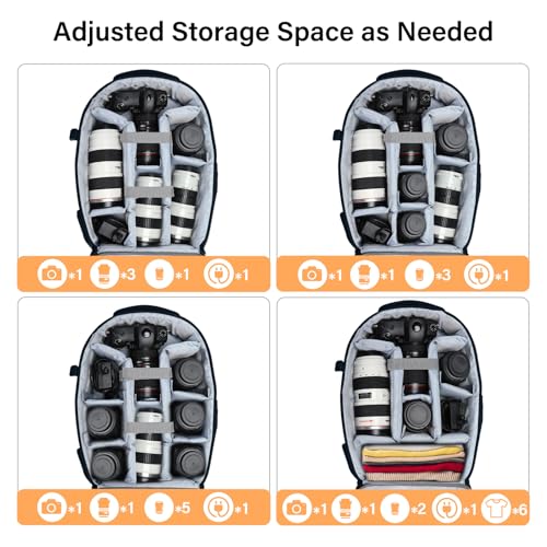 フルオープンデザイン。背面には2つのアクセサリーポケットがあり、ケーブル、SDカード、パワーバンクなどの小物を収納できます。三脚/一脚ホルダーは、バッグの片側に安全なストラップが1本付いています。もう片側には、傘や水筒(最大直径2.5まで)を収納できるポケットが1つ付いています。背面には盗難防止ポケットが1つあり、財布や携帯電話など貴重品を収納できます