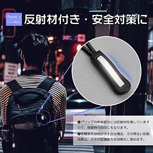 【反射材付き・安全対策に】 グリップの中央部分には反射材を施していますので、夜間時の目印にもなります。ジッパープルは反射材が付いているので視認性は良好です。夜間または光が不十分な場合、その明るい反射効果は、人々の認識能力を効果的に高め、反射材付きのジッパープルを取り付ける人もはっきりと見つけらるので、夜間の安全対策も期待できます。