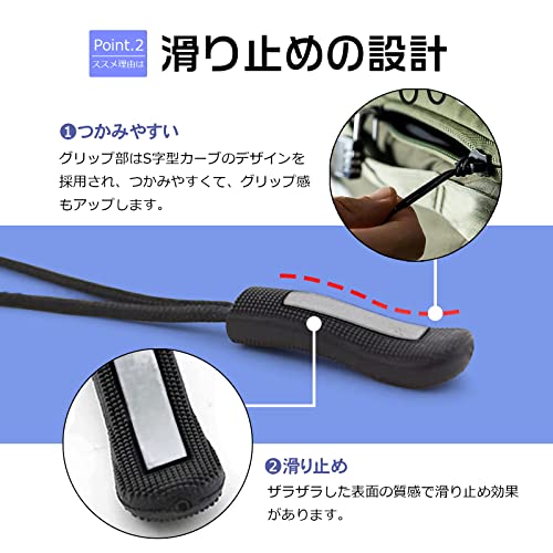 【滑り止めの設計、使い心地がいい】 グリップ部はS字型カーブのデザインを採用され、握りやすくて、グリップ感もアップします。ザラザラした表面の質感で滑り止め効果があります。また、元のファスナー引き手を伸ばすことができ、もっ
