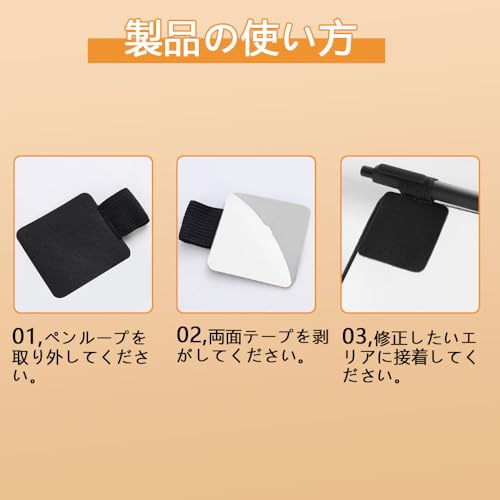 【使用方法】01,ペンル-プを取り外してくださL. 02,両面テ-プを剥03,修正したい工がしてください。リアに接着してください。