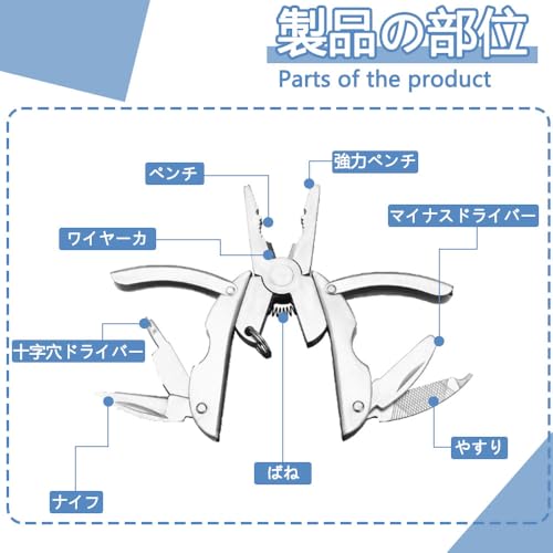 【商品特徴】 1. 多機能設計で、ペンチ、ナイフ、ドライバーなど複数の機能を持つ。 2. 人間工学的なハンドルで握りやすく、力が省ける。 3. 折りたたみ可能でコンパクトで、持ち運びがしやすい。