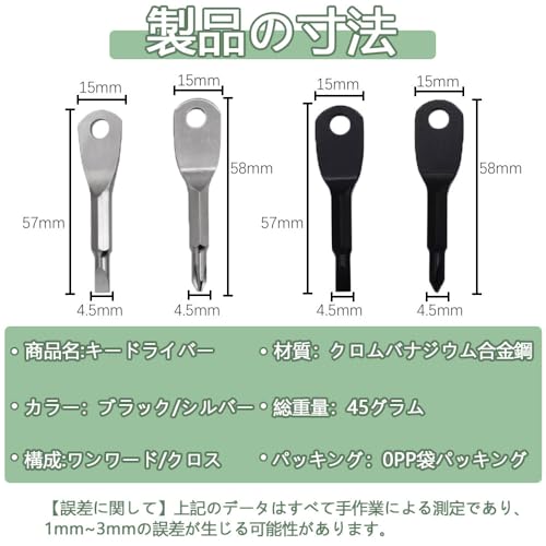 【商品サイズ】 マイナスドライバーの長さは57mm、幅は15mm、マイナスブレードの直径は4.5mmです。クロスヘッドねじ回しの長さは58mm、幅は15mm、クロスヘッドブレードの直径は4.5mmです。 全体の重量は45グラムで、持ち運びしやすいサイズです。