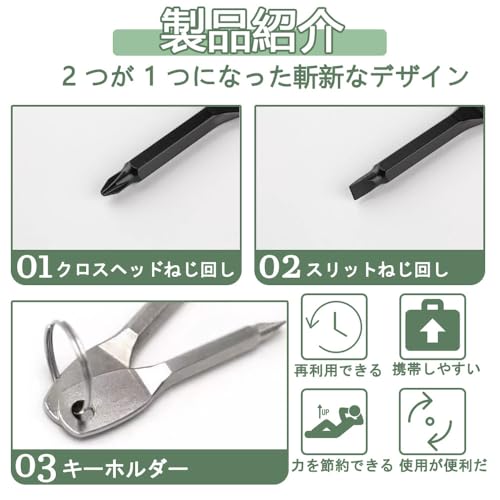 【商品紹介】 これは鍵型ドライバーセットで、クロスヘッドとスリットヘッドが各1本ずつ入っています。コンパクトなサイズで、キーホルダーにも使える便利なツールです。
