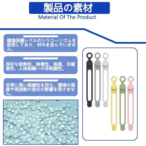 【商品紹介】 これはシリコン製のケーブル整理クリップセットで、1セットに12個入り、6色です。配線の整理や日用品の束ねに役立つ便利な小物です。ブラック、グレー、ホワイト、イエロー、グリーン、ピンクの6色展開。