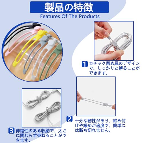 【商品特徴】 1. カチック留め具で簡単に縛れる。 2. 十分な靭性があり、締め付けや緩めがしやすく、断ち切れにくい。 3. 伸縮性があり、太さに関係なく束ねられる。