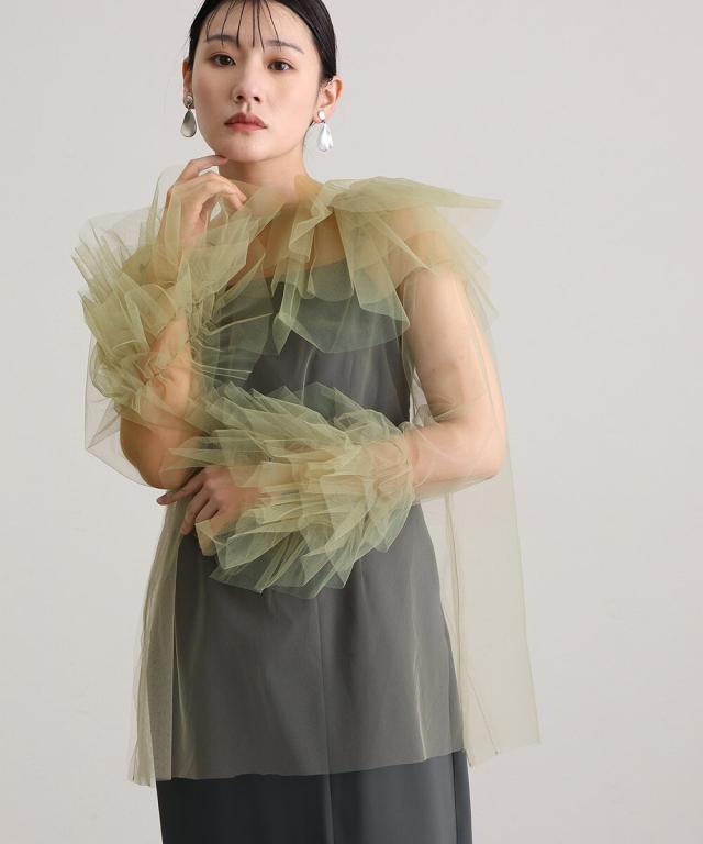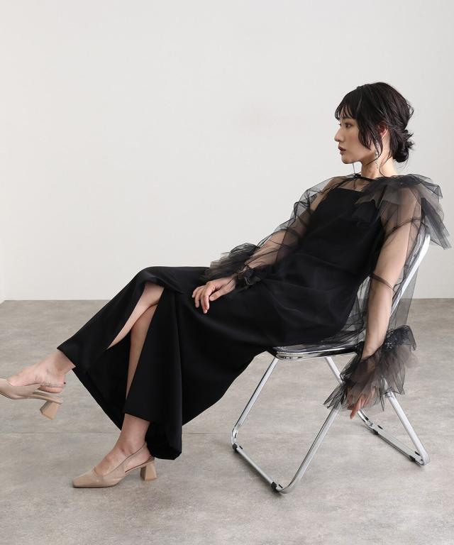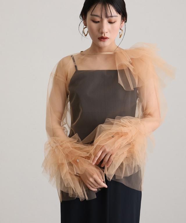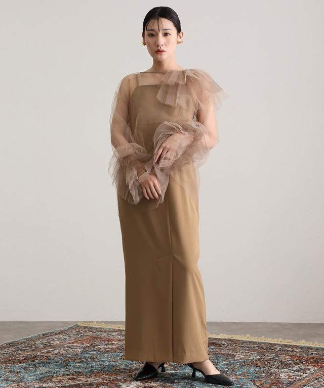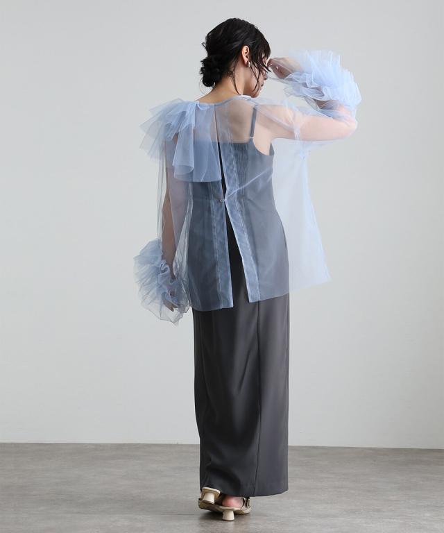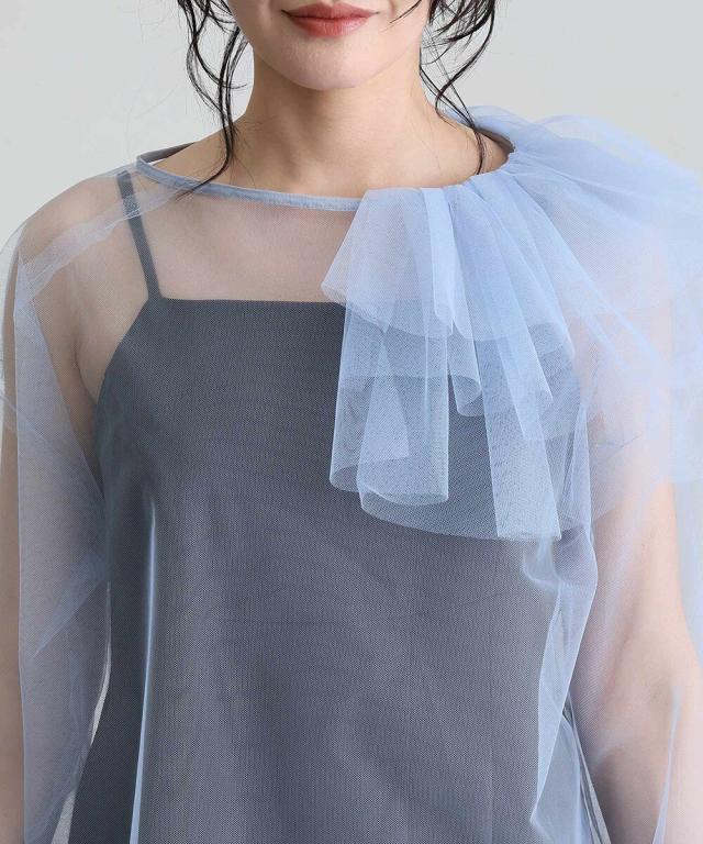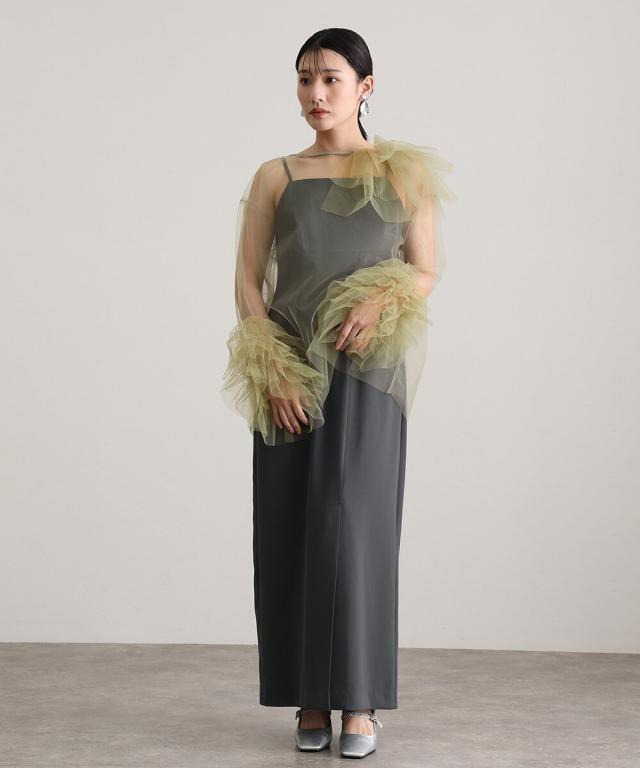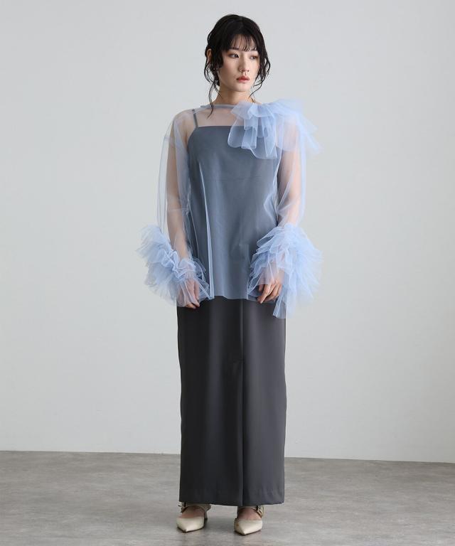 立体感とエアリーさを絶妙に両立させた、チュールフリルトップスとキャミワンピースのセットアイテム。