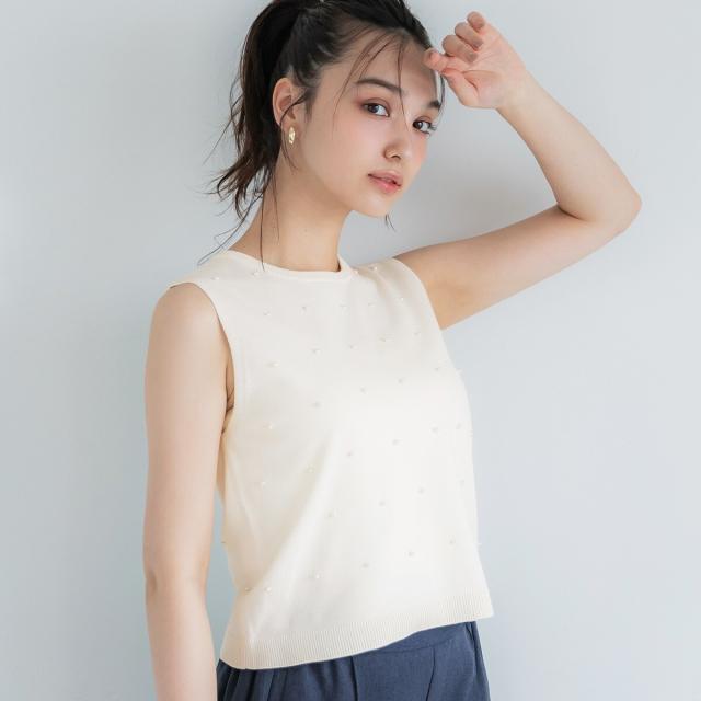 パール調のドットをあしらった、華やかさと上品さを兼ね備えたノースリーブニットです。