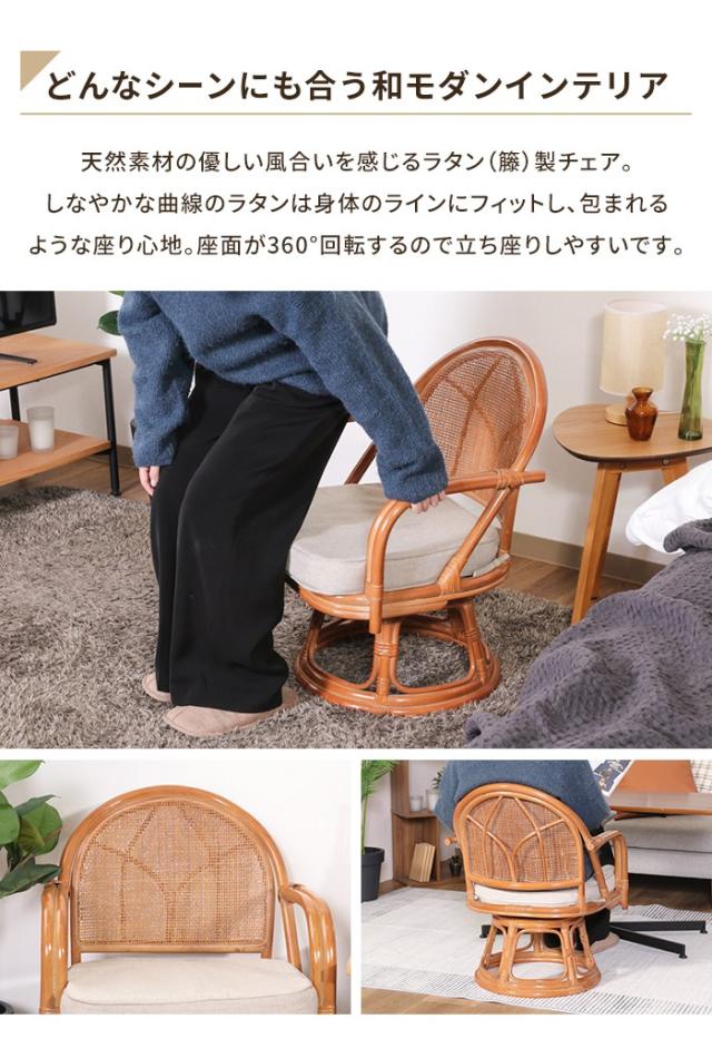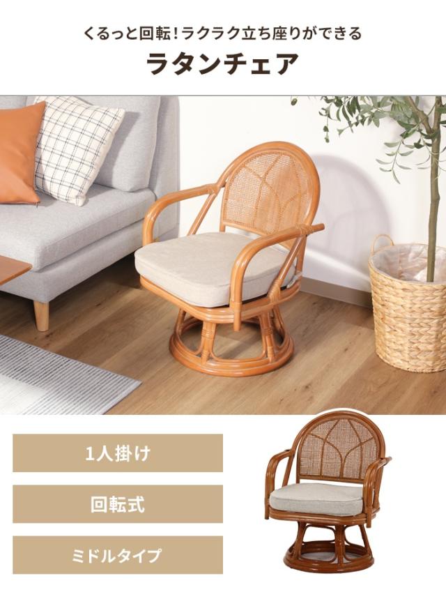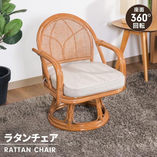 【値下げ】ラタンチェア 回転チェア 肘付き ミドルタイプ 籐 和モダン 座椅子 1人掛け 回転椅子 クッション付き 背もたれ付き シンプル