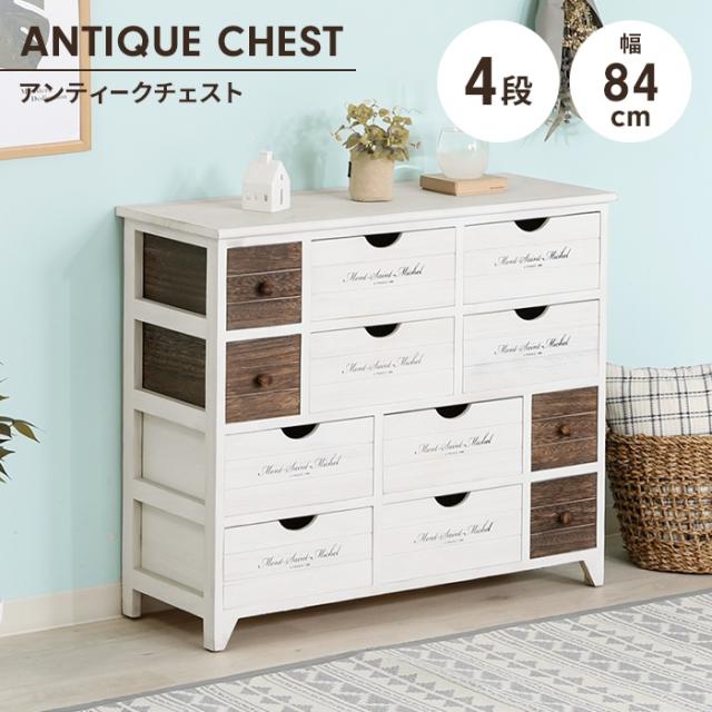 | アンティークチェスト 北欧風 木製チェスト 4段 幅84 ホワイトウォッシュ加工 脚付き フレンチカントリー シャビーシック 収納 チェスト 収納棚 ストッカー ストレージボックス 衣類収納 ストック品収納 天然木 アンティーク調 インテリア 収納家具 完成品 リビング ダイニング 寝室 ワンルーム |