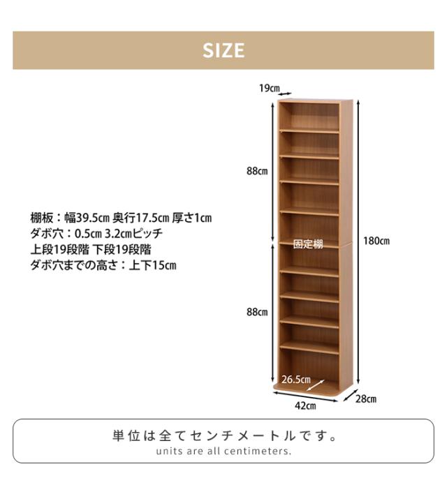 | [全体]幅42×奥行19〜28×高さ180cm [棚板厚]1cm |