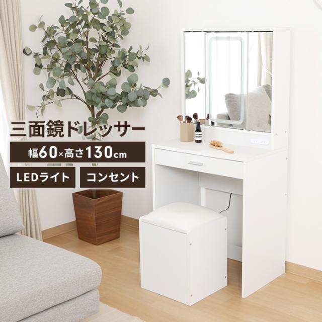 キーワード: 三面鏡 ドレッサー 幅60 LEDライト付き スツール付き コンパクト コスメ収納 メイクボックス 可愛い ホワイト 北欧風 化粧台 メイク台 コスメ台 鏡付きドレッサー デスク 作業台 引き出し 椅子付き 3面鏡タイプ LED 女優ライト 収納家具 インテリア おしゃれ リビング ワンルーム 寝室 白