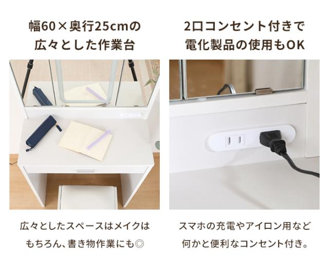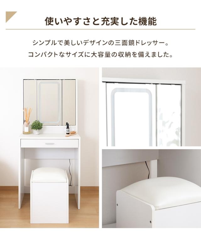 【値下げ】三面鏡 ドレッサー 幅60 LEDライト付き スツール付き コンパクト コスメ収納 メイクボックス 可愛い ホワイト 北欧風