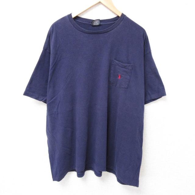 【商品名】 XL★古着 ラルフローレン Ralph Lauren 半袖 ビンテージ ブランド Tシャツ メンズ 90年代 90s ワンポイントロゴ 胸ポケット付き 大きいサイズ コットン クルーネック USA製 紺【spe】