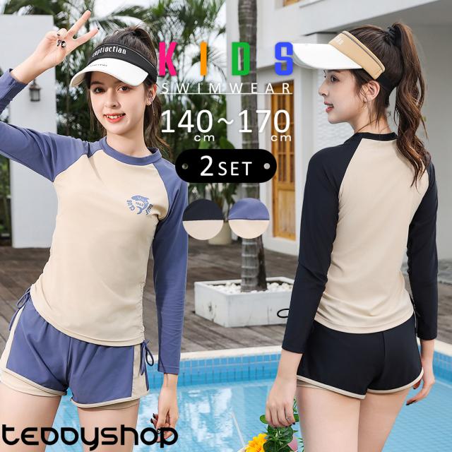 夏新作 キッズ 水着 女の子 セパレート 2点セット 140 150 160 165 170 ラッシュガード トップス 長袖 パッド付き 入れ替え可能 パンツ一体型 裏地 バイカラー いるか ロゴ ワンポイント 紫外線対策 体型カバー 小学生 高学年 中学生 高校生 黒